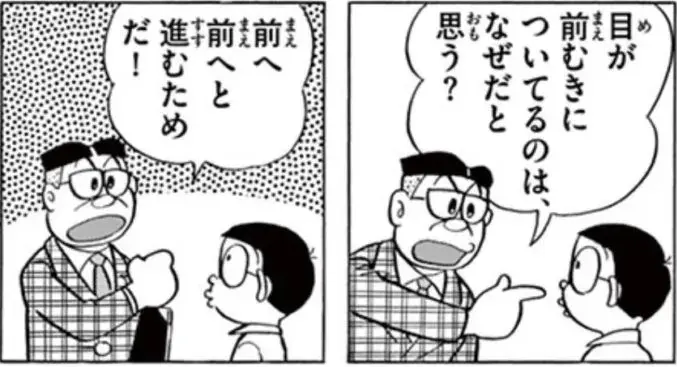 目が前むきについているのは、なぜだと思う?前へ前へと進むためだ